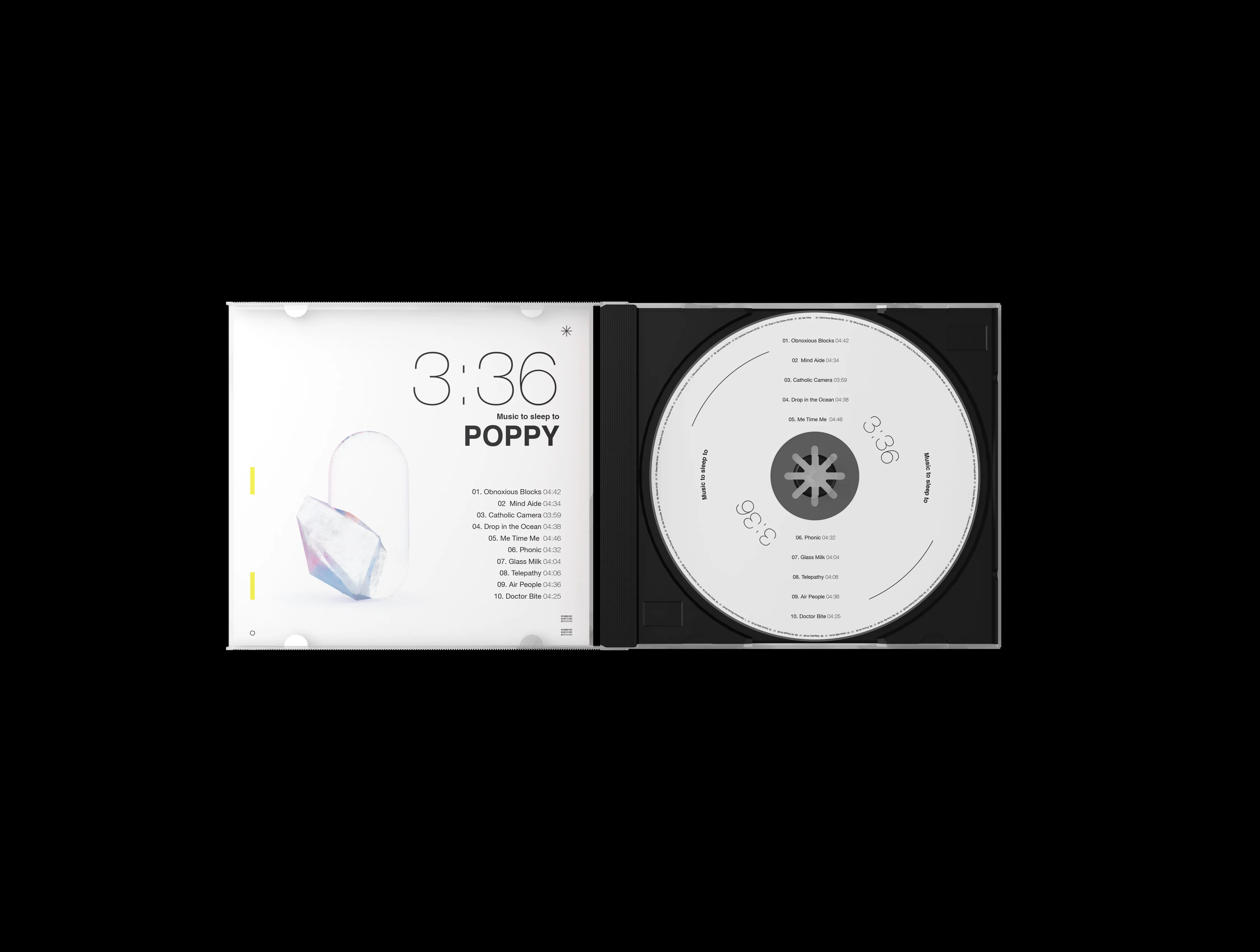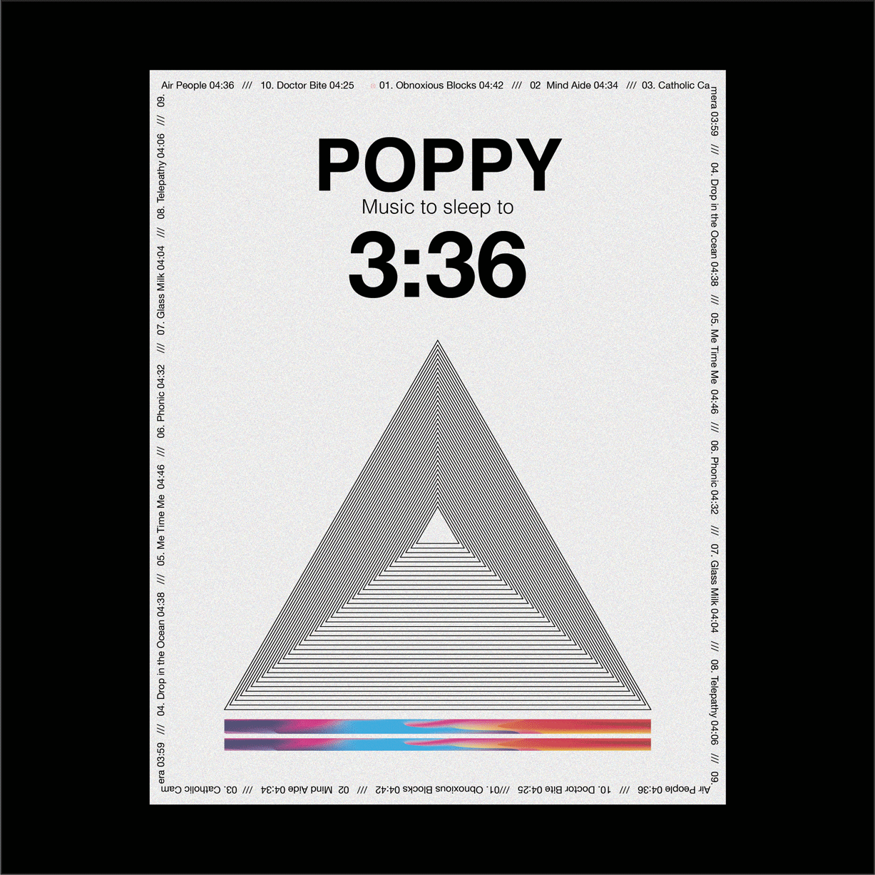 Poppy and her long-time collaborator Titanic Sinclair worked with computational neuroscientist Dr. Giselle Brotto and the Johns Hopkins University Brain Science Institute to craft sounds that could encourage delta-wave brain activity— a stage associated with deep sleep the picture on the right is the original cover, so taking inspiration from Poppy's white background Void and the cover I designed the album to have utility fonts - and a pretty minimal vibe, the challenge was to use Helvetica such that it still retains visual interest, I managed to create interesting layouts along with some motion posters.