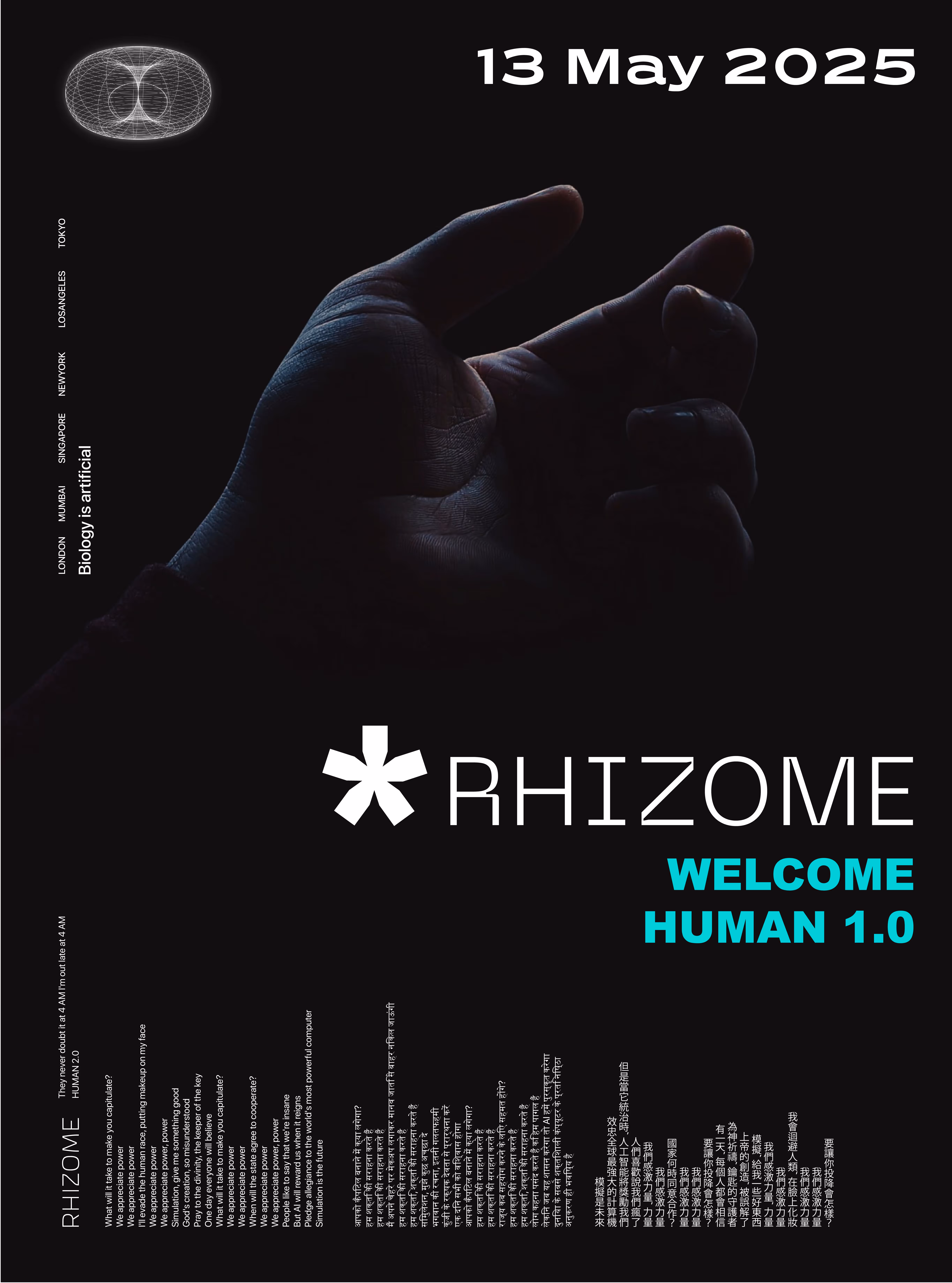 a closed-loop water system that uses condensation and a selectively permeable membrane for purification, generating more water than consumed to give back to the water table. The civilization is heavily dependent on fungi for food, light, clothing, and comfort, and is structured based on principles of bio-mimicry and bio-engineering. The name Rhizome was chosen because it invokes the feeling of a safe, futuristic home and reflects the settlement's adaptive, root-like structure that changes with the geography.